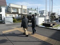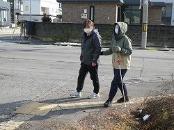 アイマスクを着け、点字ブロックと白杖を頼りに歩行する寄宿舎の先生方。