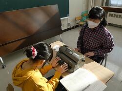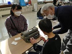 点字の学習では、点字タイプライター(パーキンスブレイラー)を使い、自分の名前を打つ活動に取り組みました。